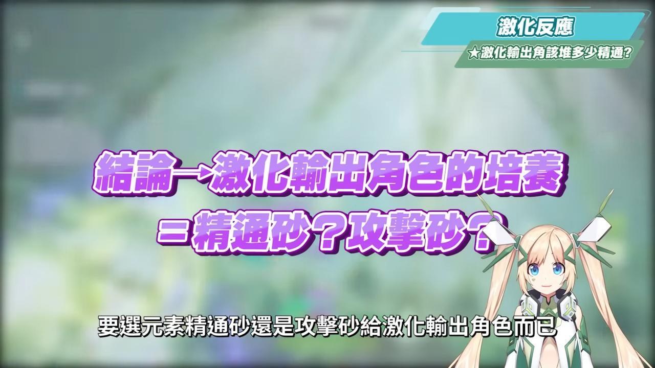 所以其實最後的選擇就只剩下在聖遺物的時之砂時,要選元素精通砂還是攻擊砂給激化輸出角色而已,因為只要有穿元素精通的時之砂,大概率就可以來到200~300左右的元素精通,大約是70~100%的激化傷害加成,剩下空之杯與禮之冠的部分還要留給元素傷害杯以及雙暴頭,以激化輸出角來說,這樣就十分夠用了。