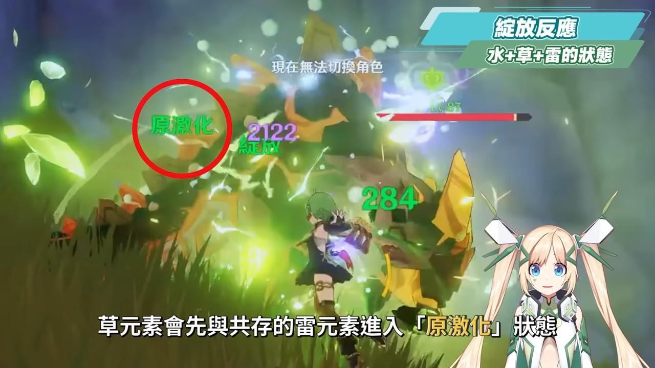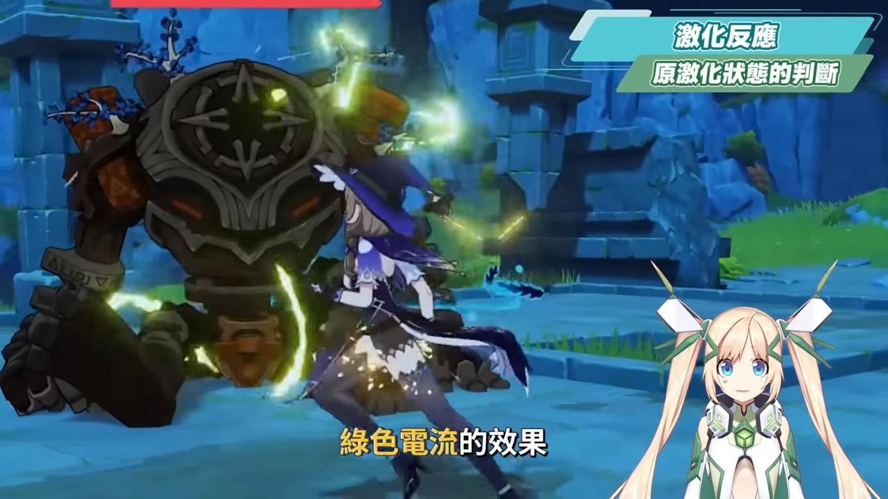 再換種情況此時怪物身上為草+雷的「原激化」狀態,再加上水元素時,水元素會先和怪物身上的被激化草元素形成綻放反應,而等到怪物身上的激化草元素消耗完後,身上還有殘留雷元素的話,剩下的雷元素就會再與水元素產生感電反應。