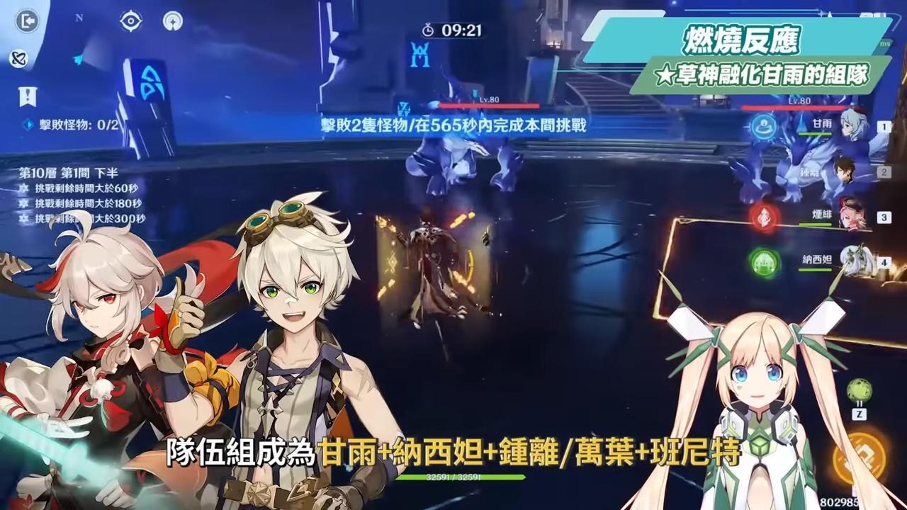 燃燒反應和綻放反應的差別在於,綻放反應是主要草+水元素,但可以再加上可共存的雷元素,形成一種水草雷皆可兼容的反應隊伍,同時還可以搭配風元素聚怪和減抗增傷,但燃燒反應中,除了要在短時間內持續補上草元素,以利燃燒狀態的延續,並且聚怪性質的技能其實並不會使燃燒反應像超載一樣被聚怪後得到加分的作用,因此燃燒反應總體來說就是持續時間短、不吃聚怪收益、又需要可持續上草的精通角色,當前草元素角色中最適合的就是納西妲,而也因為目前高精通所產生出來的燃燒傷害,以90等且元素精通1000的角色,搭配風套減抗所觸發的燃燒反應,2秒燒完的傷害也只有2萬出頭,所以比較適合的燃燒輸出隊員目前可能還要等後面的須彌角色。