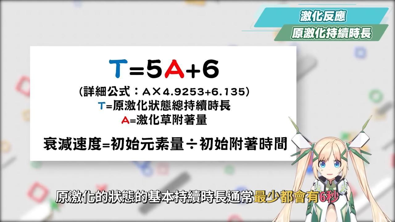 原激化的狀態的基本持續時長通常最少都會有6秒,大部分弱草和弱雷元素觸發的情況下都會落在10秒左右,若是透過強草和強雷則可以最長來到14秒左右,如果想了解持續時長和衰減速度的話可以參考下面公式: