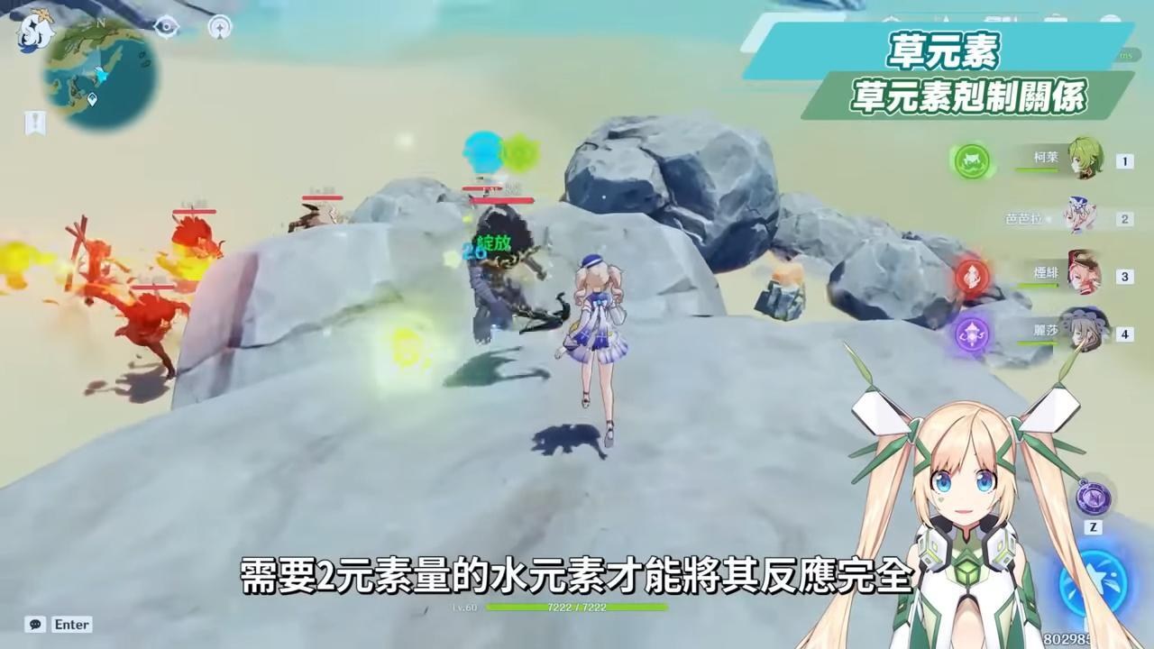 草元素前面有提到,主要是剋制水元素,也就是1元素量的草元素,需要2元素量的水元素才能將其反應完全,所以像是在破水深淵法師護盾的時候,用草元素破的時候效率是最快的,所以如果先對敵人攻擊附著弱草元素,再用弱水元素觸發反應,敵人身上還會有草元素附著,可以看到敵人頭上還會有殘留的草元素符號。