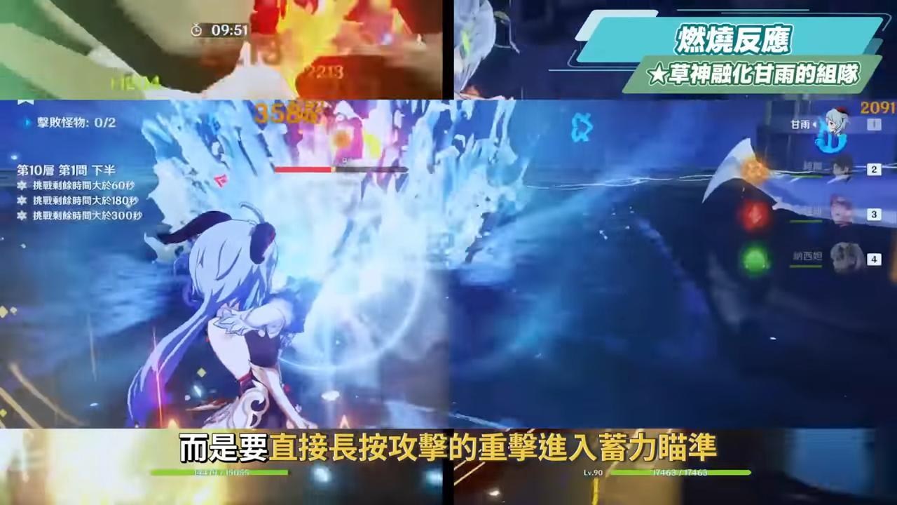 手法上要注意的是,要讓甘雨的第一箭蓄力射擊能有效觸發納西妲的滅淨三業,因此滿命甘雨的瞬發手法在這個隊伍就不適用,每發融化箭矢都要弓拉好拉滿,並且不要按R使用瞄準射擊模式,而是要直接長按攻擊的重擊進入蓄力瞄準,射擊完後衝刺再直接長按攻擊蓄力射擊,這樣的時間差會比較不容易讓燃燒狀態斷掉,隊員若是有搭配鍾離的話,也要注意不要讓結晶反應干擾燃燒反應的觸發過程,而若是燃燒狀態不小心中斷就要重新再點火上草。