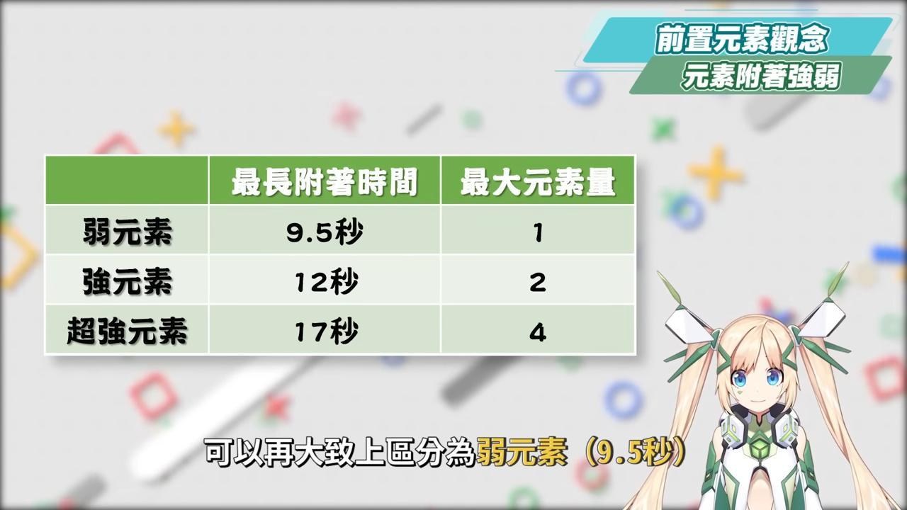 而元素附著按照最長時間附著的三種時長,可以再大致上區分為弱元素(9.5秒)、強元素(12秒)、超強元素(17秒),而也為了方便計算跟理解,我們可以再假設弱元素的能量為1、強元素的能量為2、超強元素的能量為4。