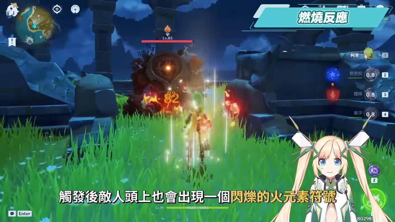 而燃燒反應的過程中,草元素存在的時間很短,正常狀態下的弱草元素大約2秒就會被燒完,但只要在這中間閃爍的火元素標記尚未消失前,於2秒內持續補上草元素,就可以使燃燒狀態的時間得到延長,也能當成是一種「添加柴火」的概念。