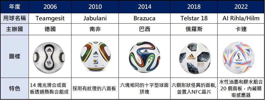 歷代世足比賽用球有哪些特色呢? 卡達世足的「Al Hilm」與「Al Rihla」比賽用球添加哪些創舉呢? 以下作一整理與說明: