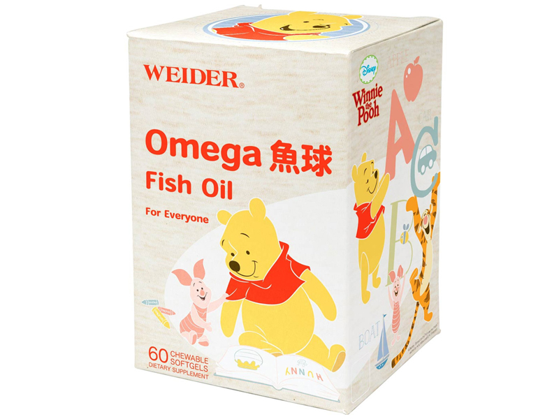 威德Omega魚球,一盒有60入,這款是芒果柑橘口味的咀嚼式軟膠囊,盒上食用建議兒童每日1粒,成人每日1至2粒,一天不要超過2粒,多食無益,大人、小朋友一家人都能食用。這款有添加100%紐西蘭牛初乳、添加鋅+碘。迪士尼小熊維尼外包裝,帶去學校小孩看著都開心。