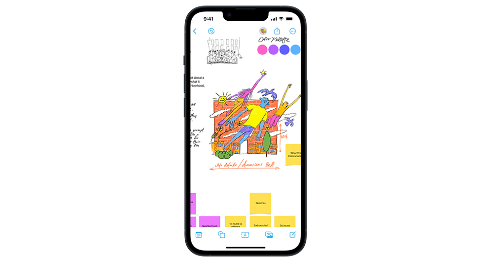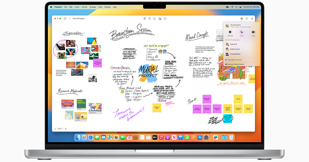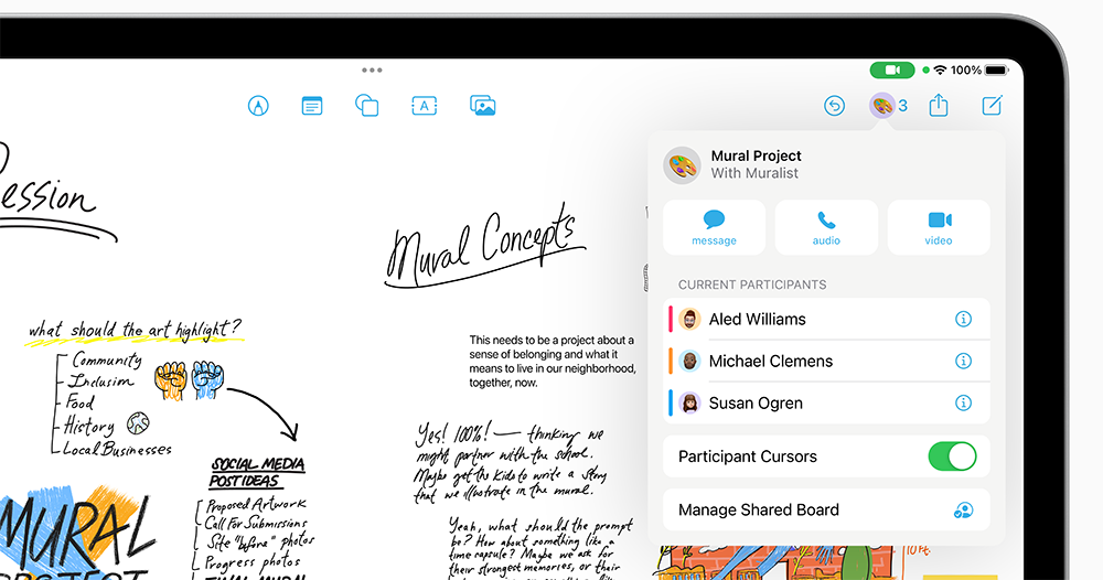 既然具備有即時同步的能耐,Apple 也沒有提供同時最高 100 人協作進行腦力激盪的用途。這項功能不僅能完整支援以 Apple Pencil 或是簡單以手指進行繪圖筆記的功能,更能直接在 Mac 以鍵盤滑鼠等輸入的方式一起協作。