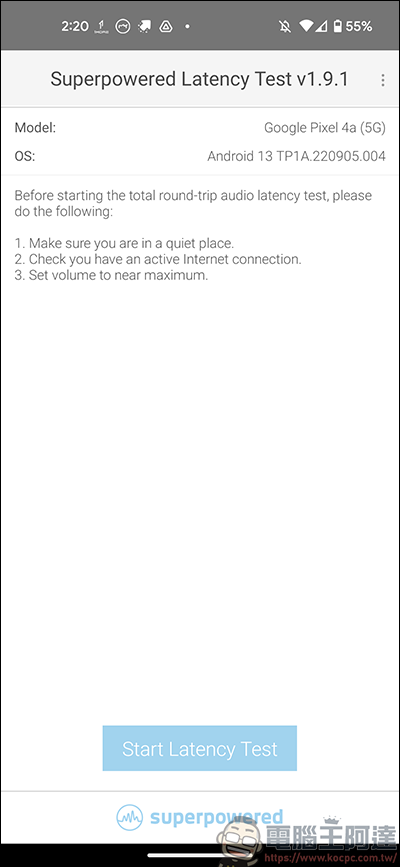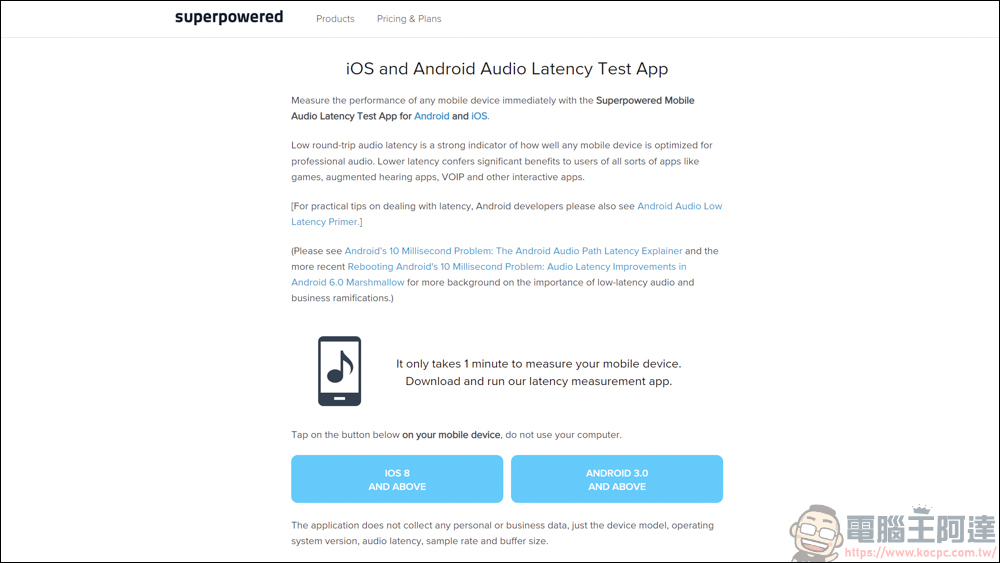 Latency Test 是美國一家 superpowered 所開發的 APP,專門用來測試藍牙耳機設備的延遲,iOS / Android 兩種版本都有,但都沒有在 APP 商店上架,所以必須透過從網頁下載的方式另外安裝,對這種 APP 感到不安心的,建議還是不要貿然嘗試,以免手機出問題: ( 下載地址 )