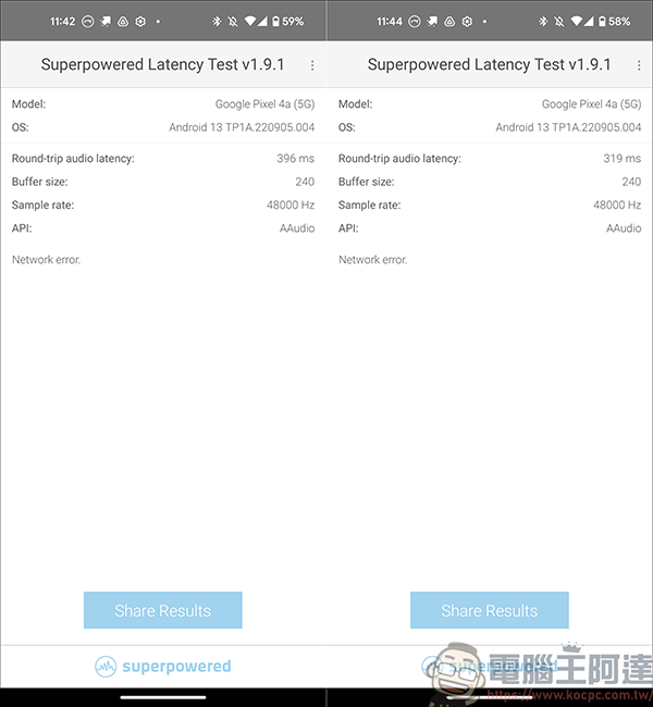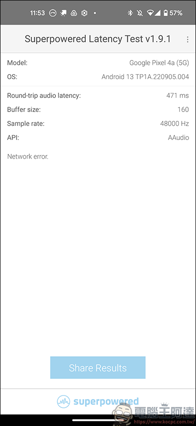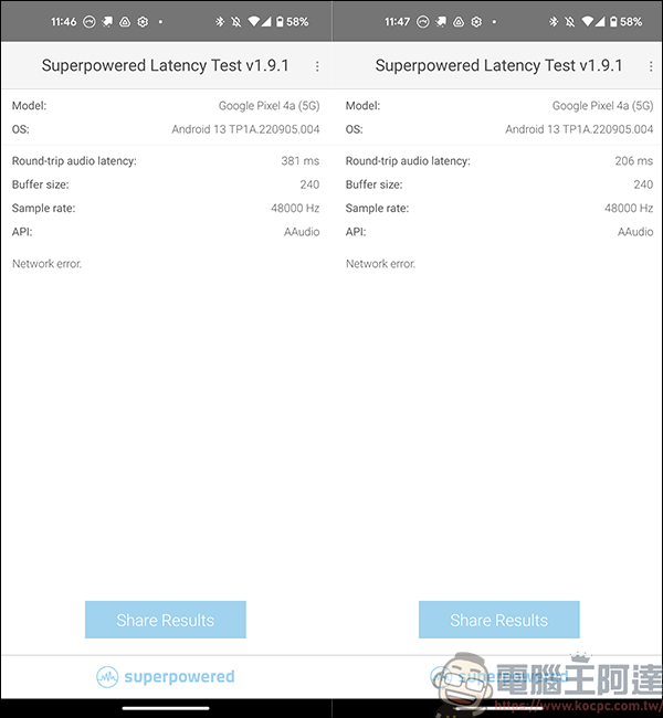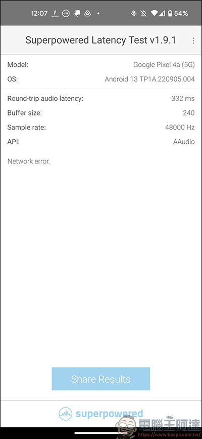 最一開始的時候要先進行手機揚聲器延遲測試,將手機聲音開最大聲之後,再按下 Start Latency Test,等待一段時間後,上面的 Round-trip audio latency 那列就是目前測得的延遲數值,也就是手機本身的延遲: