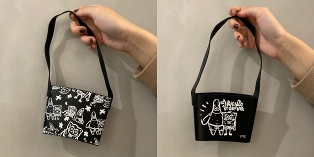 跟第一波一樣有「比奇堡飲料提袋」,海綿寶寶和派大星兩人肩搭肩,刻有「Friends Forever」,底色為黑色,筆觸則是白色線條,材質選用皮革,不僅提升質感,可愛又不失實用性,以後買老賴帶比奇堡飲料提袋準沒錯!