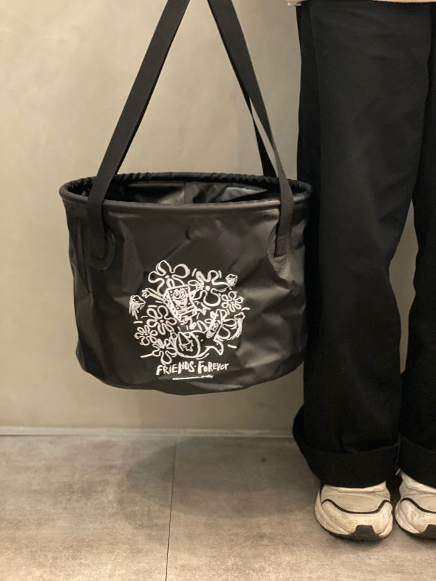「比奇堡購物袋」平常不用的時候可以折收成手掌大小,輕巧又好收納,配色為時尚酷黑,正面打開會有海綿寶寶和派大星組隊跟大家打招呼,背面則是滿版的各式造型,身為黑色狂粉的妞妞們,這個必收!