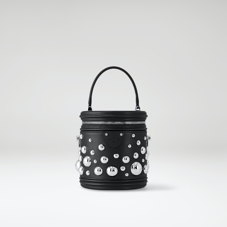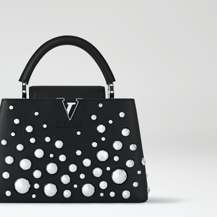 另外,以典雅著稱的「Capucines」手提包,在金屬鏡面球的裝飾下,搭配上全黑的包身,瞬間變得超級有個性,而提把銜接的環扣以及包緣的 Louis Vuitton 縮寫字樣中,則呼應包身的鏡面球體,以更為冷色調的銀色金屬呈現。