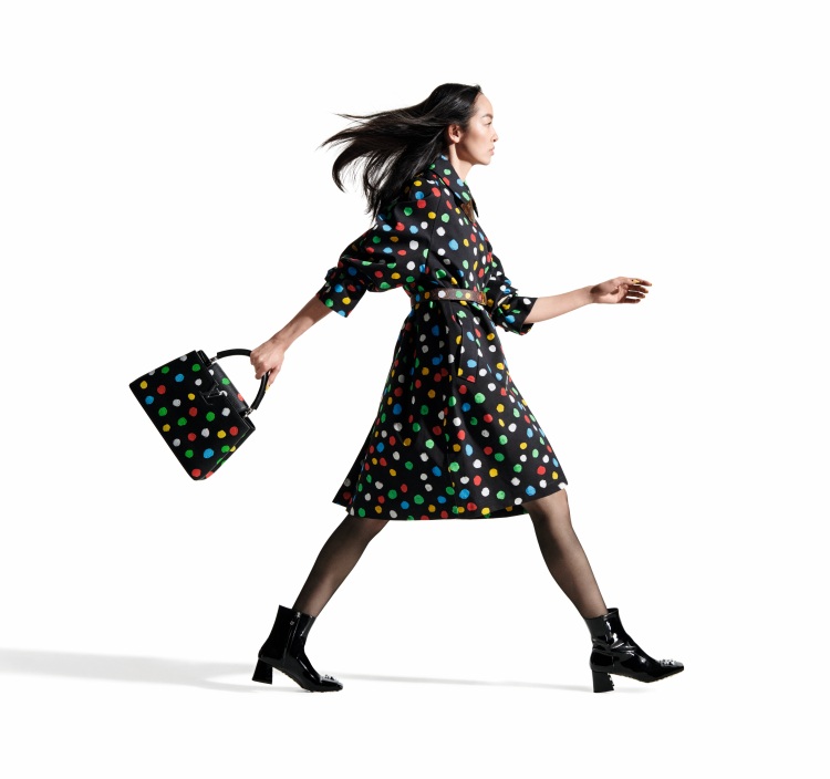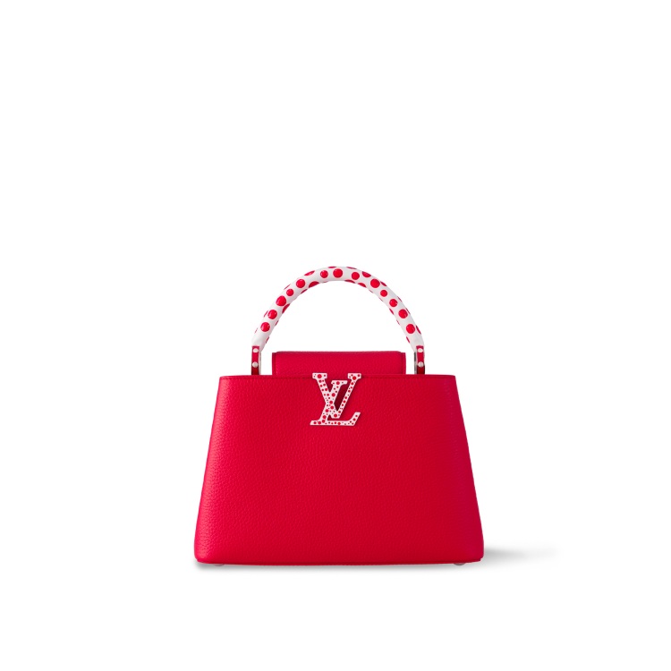 身為品牌旗下最頂級的包款,「Capucines」的款式有別於滿版的圓點創作,設計師反而以內練的形式呈現其包袋的魅力,在配色上品牌以正紅為底色,標誌性的圓點畫作則呈現在包釦及提把上, Louis Vuitton 巧妙的讓包款在百搭內斂之餘,依然保有其聯名的特色。