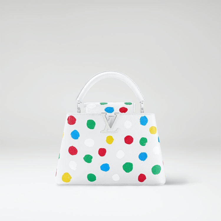 同樣是「Capucines」這款最具優雅氛圍的手提包,換上全白外衣再搭配上彩色圓點後,包款整體瞬間減齡,相比於過去給人的成熟印象,本次聯名的「Capucines」更具有玩心!