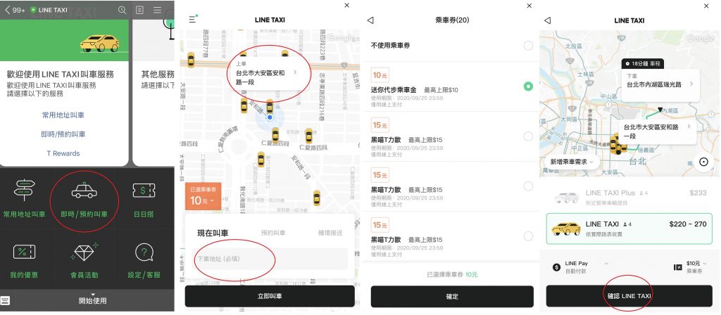 - 選擇「乘車優惠券」按下確認:LINE TAXI 不定期提供優惠唷!可在畫面左下角點擊橘色方框選擇你想要折抵的乘車優惠,即可在當趟折抵。(小提醒:一趟行程限用一張乘車券唷!)