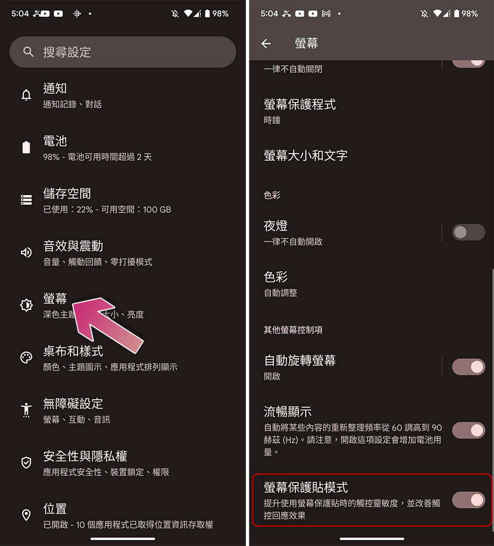 - 捲到最下方,將「螢幕保護貼模式」開啟。這項功能可以強化使用保護貼時的觸控靈敏度,不僅有助於指紋辨識,你在滑手機時的觸控感應也會更順暢。