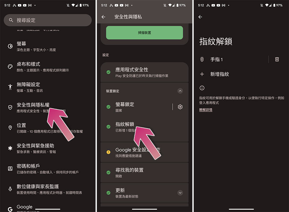 - 在輸入完鎖定圖形(或是密碼)之後,先把原本設定的指紋都刪除,再重新登錄指紋。