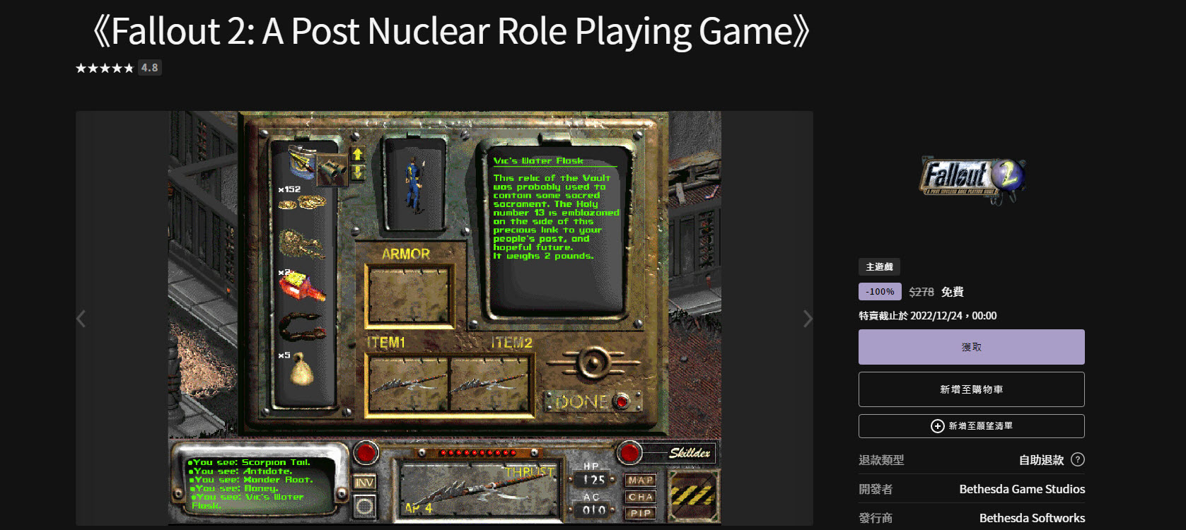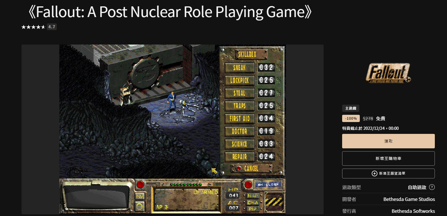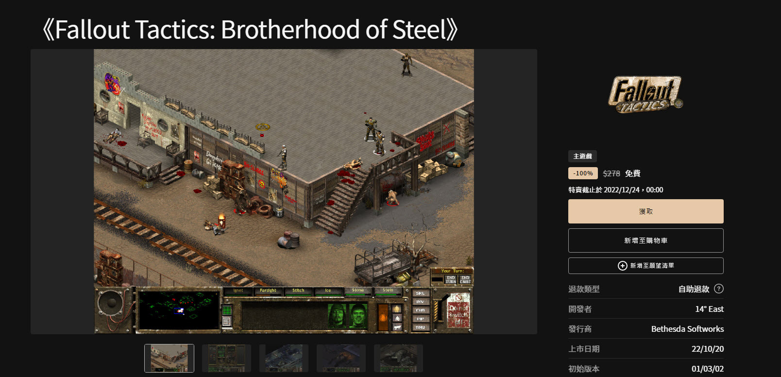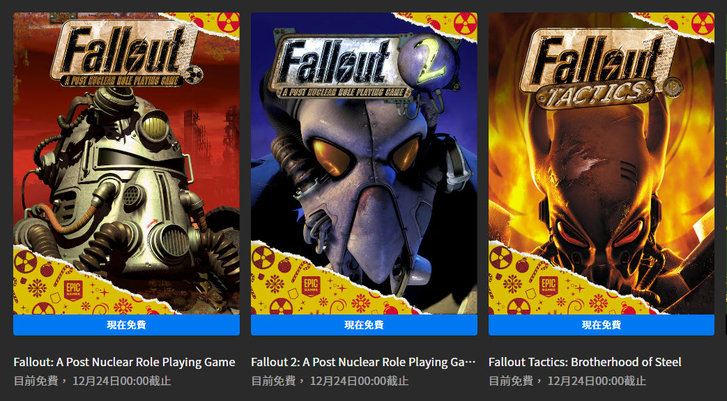 Epic Games Store於聖誕假期推出的每日限免遊戲活動,今天最新提供的限免遊戲為《異塵餘生》、《異塵餘生 2》及《異塵餘生戰略版:鋼鐵兄弟會》,限時免費期限只有 24 小時,直到 12 月 24 日 00:00 截止,領取後即可永久保存。