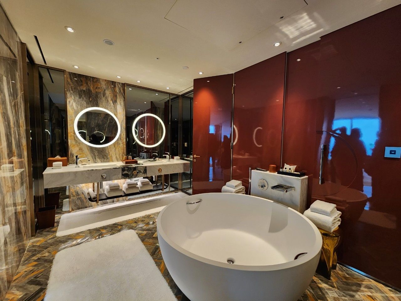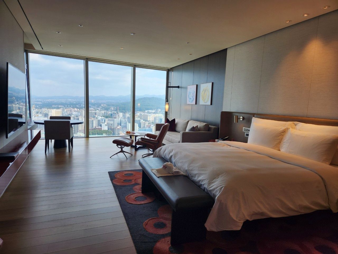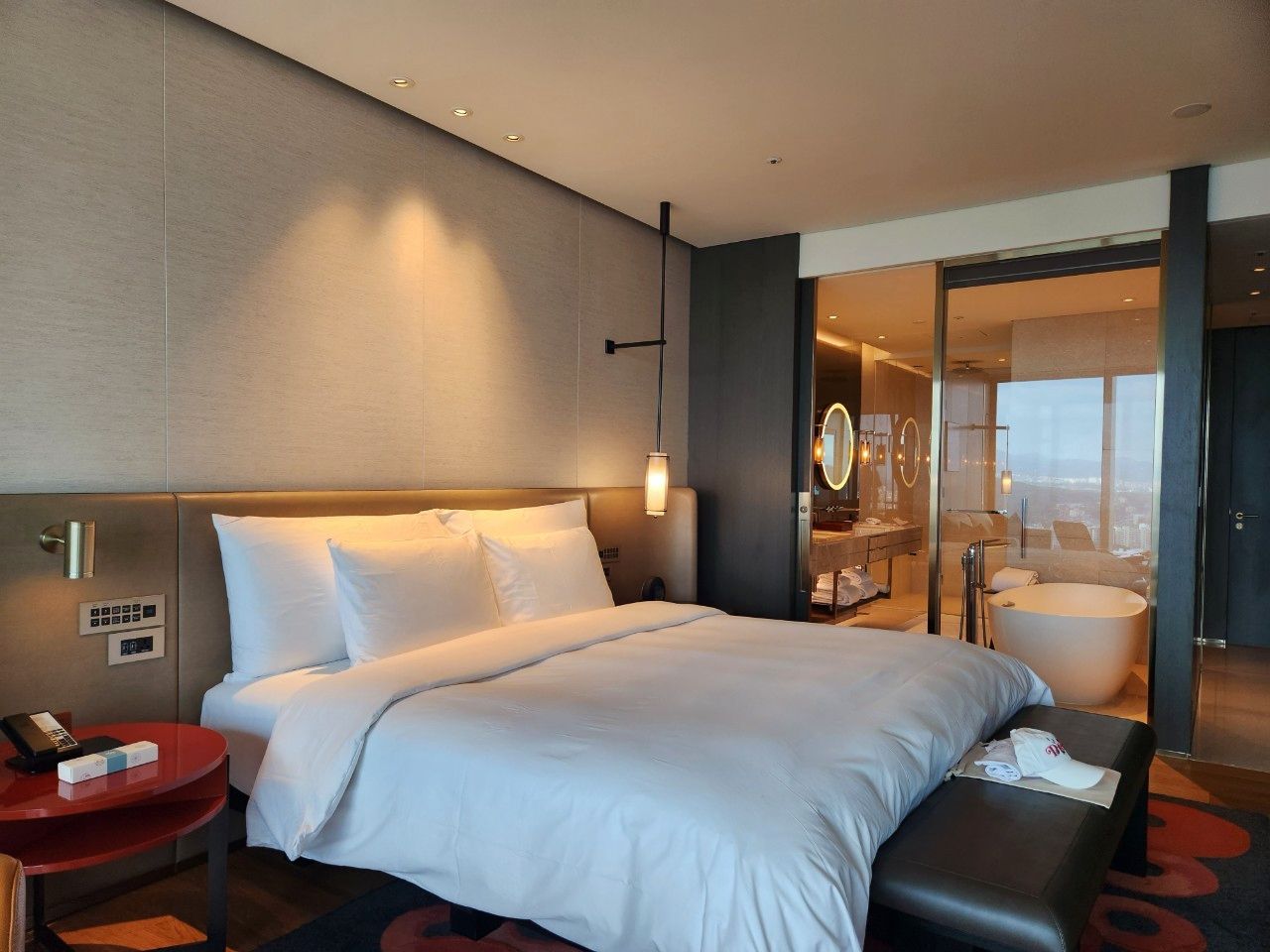 每一間房間都有整面的落地窗可欣賞來自濟州盛景「漢拏山」,有海景與城景兩種房型可供選擇,房內設施還有三人位長沙發、Nespresso咖啡機、75英寸三星智能平板電視,以及絕美的大理石浴室和環島式浴缸,套房形式的房間更多了6人及以上餐位餐桌與步入式衣帽間,豐富設施讓人待在房間就不想出門~(清晨開啟窗簾被陽光喚醒的那一個真的好療癒)