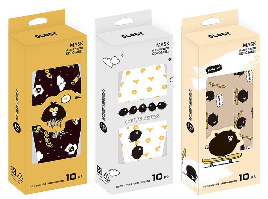 這款奧樂雞口罩有三層結構,表面採用防潑水不織布,具防潑水效果,中層是熔噴過濾不織布,靜電吸附過濾層,內層以超柔親膚不織布,舒適複合材質,柔軟接觸臉部肌膚。多款奧樂雞聯名圖案可以隨心所欲選擇,每天使用的時候都能有好心情!