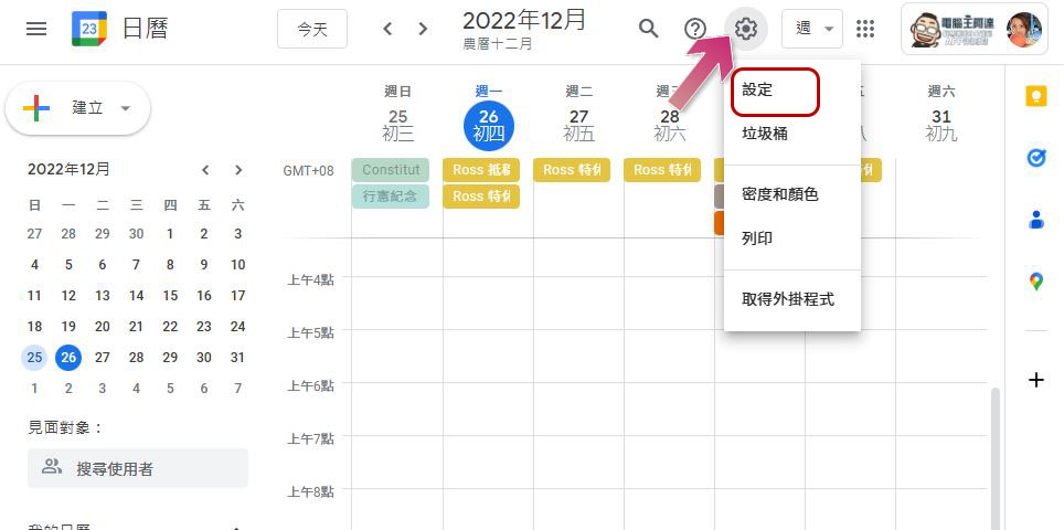 - 打開 Google 日曆的設定。