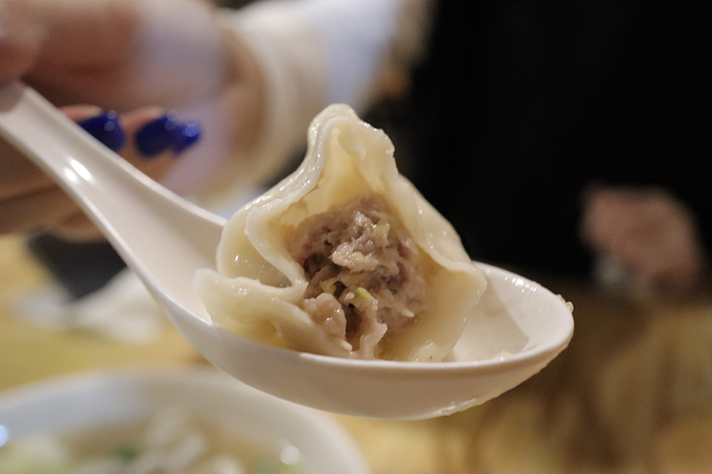 它們家的水餃一顆7塊不算便宜,一入口你會先感受到麵皮的香氣,雖然不主打皮薄,但他們家的水餃皮非常有嚼勁,麵粉香氣十足,即便放冷味道也依舊美味;內餡部分,滿滿的高麗菜與豬絞肉結合,鮮甜的高麗菜汁中和了豬腳肉的油脂,一口劃開滿滿湯汁傾瀉而出,彷彿像小籠包一樣!主食方面還有陽春麵、牛肉麵等,不過相較之下陽春麵就略顯普通。