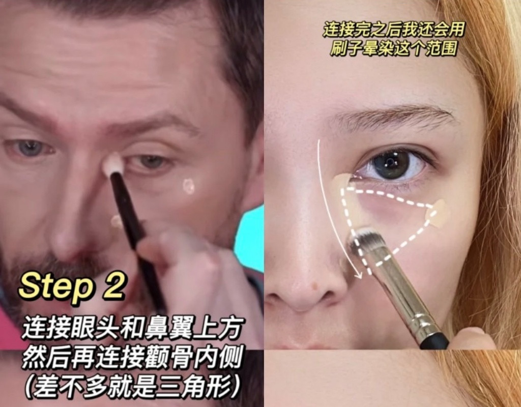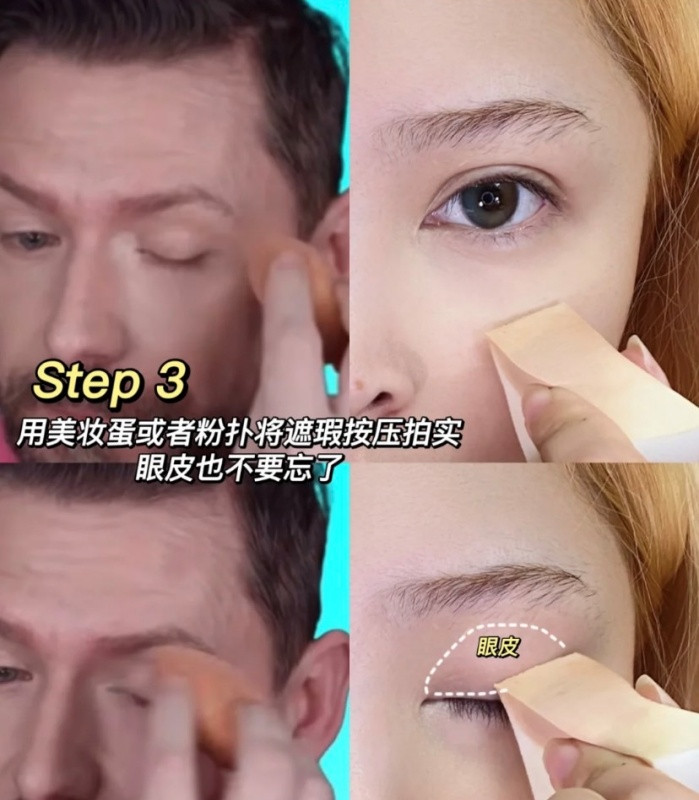 緊接著,再拿出美妝蛋或粉撲,將三角形區域內的遮瑕按壓拍實,最後也別忘了稍微帶到眼皮唷~因為我們的眼下其實是充滿各種紋理的,所以多了這步驟可以幫助遮瑕更完美服貼!