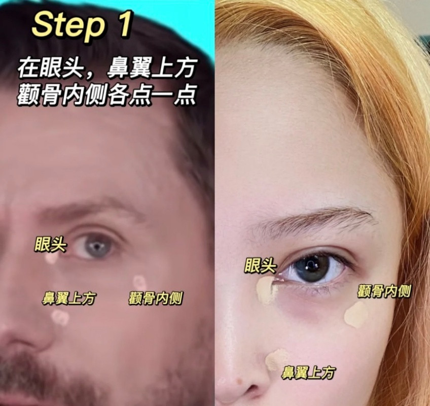 三點遮瑕法步驟1:眼頭、鼻翼、顴骨內側點塗遮瑕