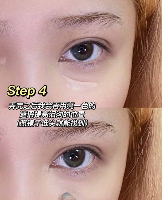 最後,也可以在眼下3公分處,使用米膚色遮瑕,提亮在眼下淚溝的位置,就可以進一步勻亮眼周,讓整個底妝看起來更飽滿明亮。