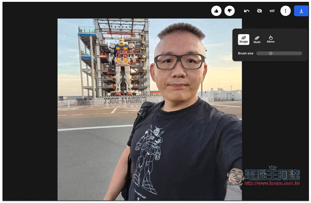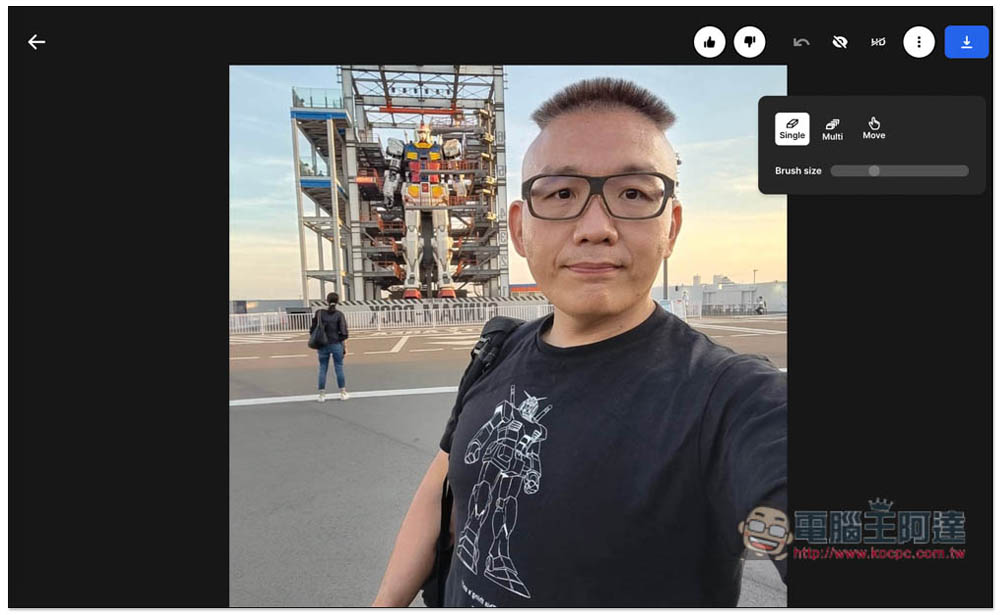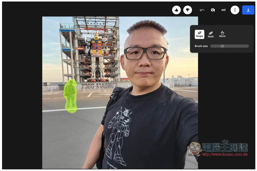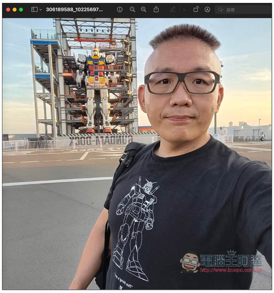 像這樣,如果沒有仔細看,相信有些人一定猜不到原本阿達後面有一個超大鋼彈,看起來就像是在一個超空曠的地方自拍而已: