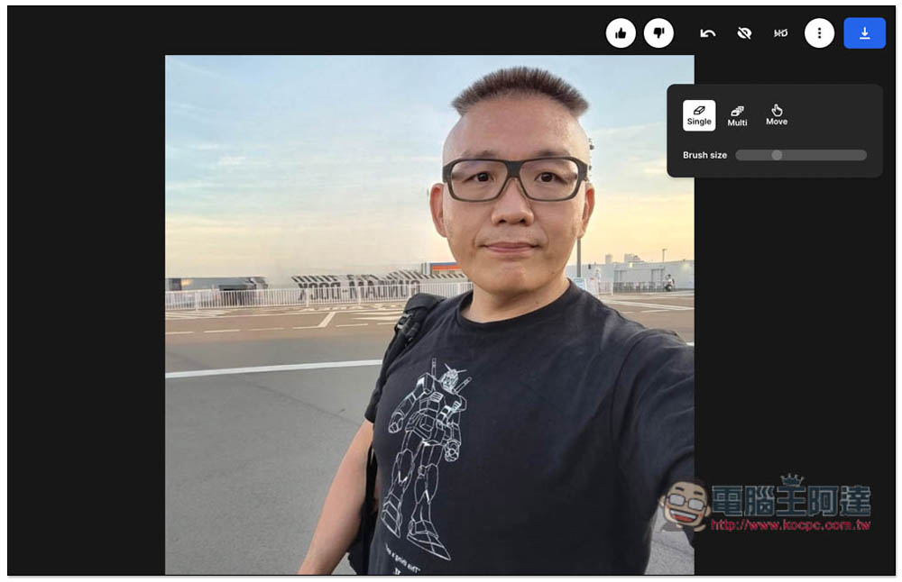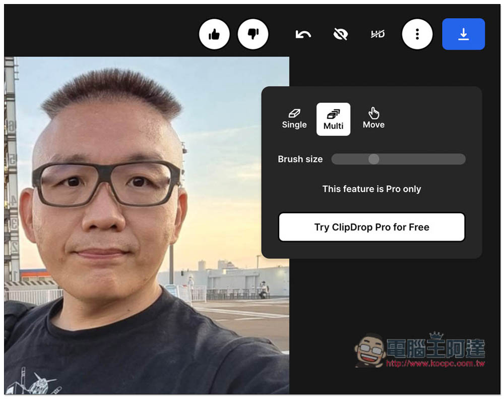 去除後效果滿意的話,就可以按右上角下載箭頭下載下來,也支援直接把圖片丟到其他 ClipDrop 線上工具,如:移除背景 Remove background、放大 Enhance/Upscale、點亮 Relight: