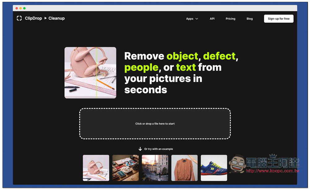 ClipDrop 是一個提供非常多免費線上工具的網站,除了這篇要介紹的移除照片中的人物、物件功能 Cleanup 之外,還有去背、放大照片尺寸、替換背景等等,有需要的人也能自行試試。進到網站後,就可以把你要移除的照片、圖片拖曳進來。想先試試看的,下方也有提供五張範例圖片,不過範例通常去除效果都很不錯,因此不具參考價值: