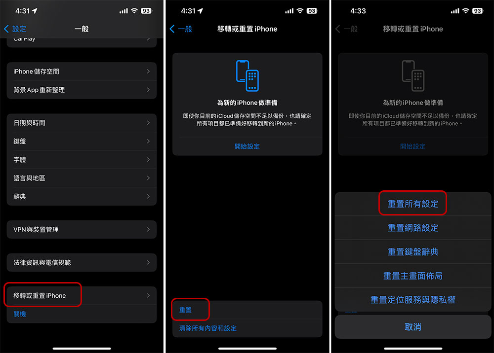 - 在接下來的頁面中選擇要重置哪個部分,這邊我們選「重置所有設定」,然後跟隨指示一步步操作完畢。