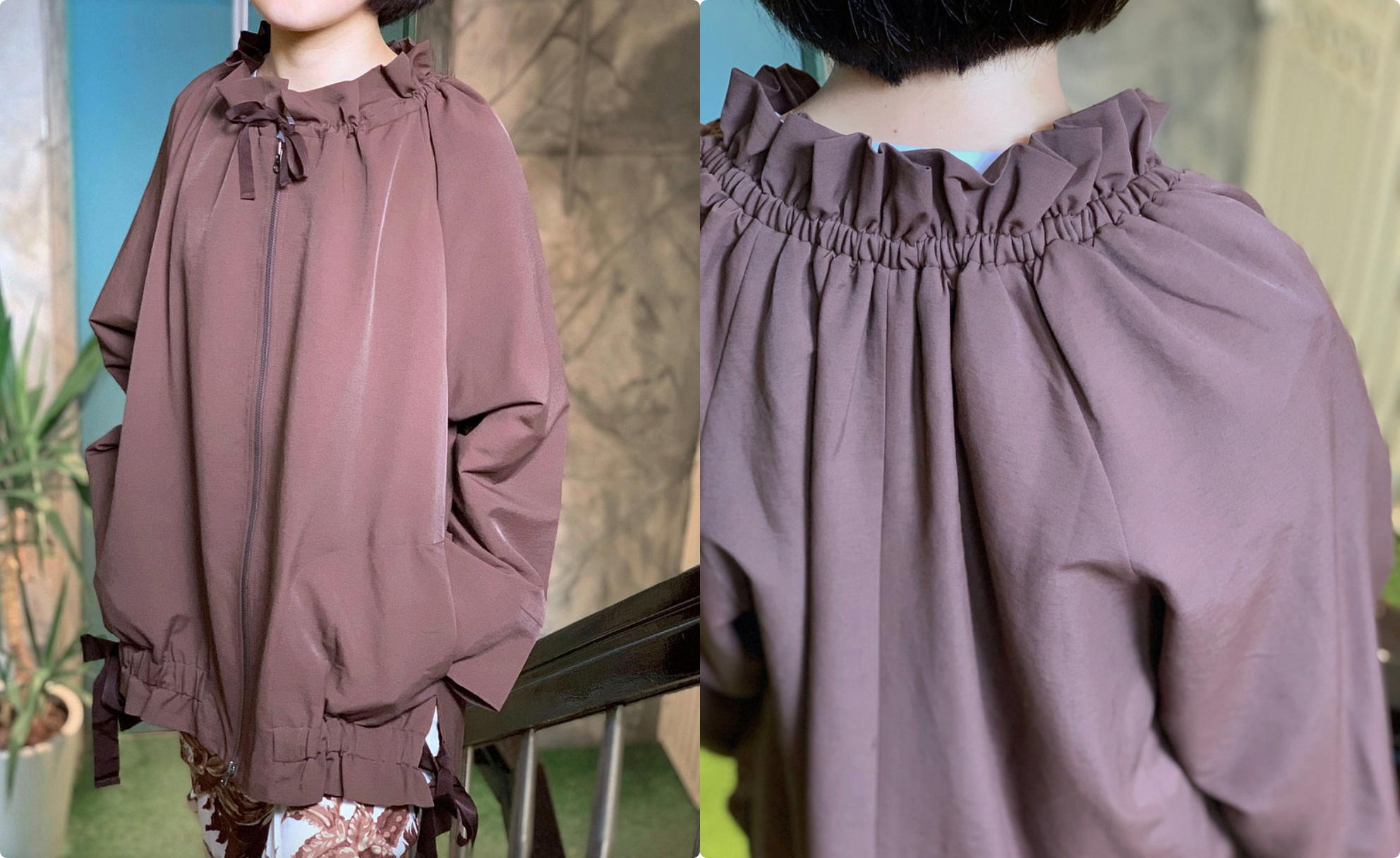 上面如果是低調版的荷葉領外套,那麼這件就是高調版,不僅是在領子,連在下緣都做了荷葉邊設計,整件外套圍繞著荷葉設計。穿起來不僅可愛也很有型,另外在側邊都做了隱形口袋,方便放置物品。除了有襯膚的大地色之外,也做了比較低調一點的黑色,並且在下襬使用蝴蝶結作為裝飾。