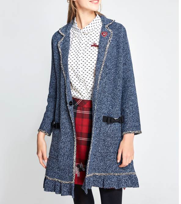 針織外套常常因為垂墜感而覺得太沈重,在下擺的地方做點荷葉設計,讓整件針織外套看起來輕盈許多,即使外套的顏色是令人覺得比較重的深色,也不會太過有壓迫感。另外這件外套口袋的蝴蝶結,為整體增加了一點甜美感。一點小設計就讓外套有了不一樣的生命力,荷葉邊不僅是華麗代表,也算是活力元素之一呢!