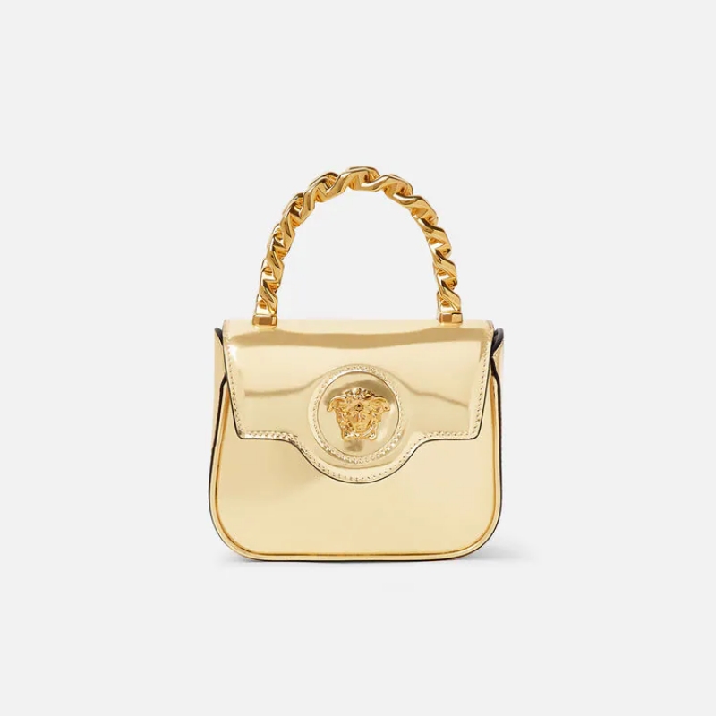 說到金色包包,怎麼能忘卻留著義大利血統的Versace,最恨極簡主義的Donatella Versace,真的不會放過這個機會,一向不浮誇不行的設計語言,來到這個小巧的手拿包上,精細的雕上“美杜莎”頭像,手提把上的設計,浮誇控一定愛的要命!(參考售價:NT$)