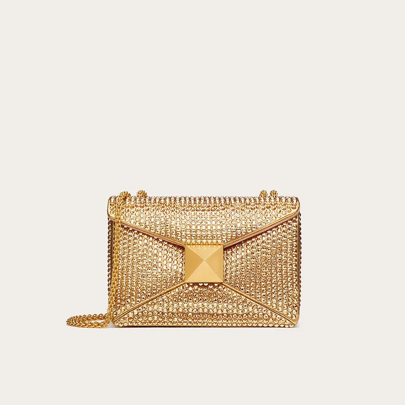 密集恐懼症的人可能會很怕,但懂Valentino的朋友應該就愛得要死!滿滿的金色,超大鉚釘的開合扣,加上滿版的施華洛世奇水鑽,復古黃銅做舊的復古金色調,讓女人愛到不行!(參考售價:店洽)