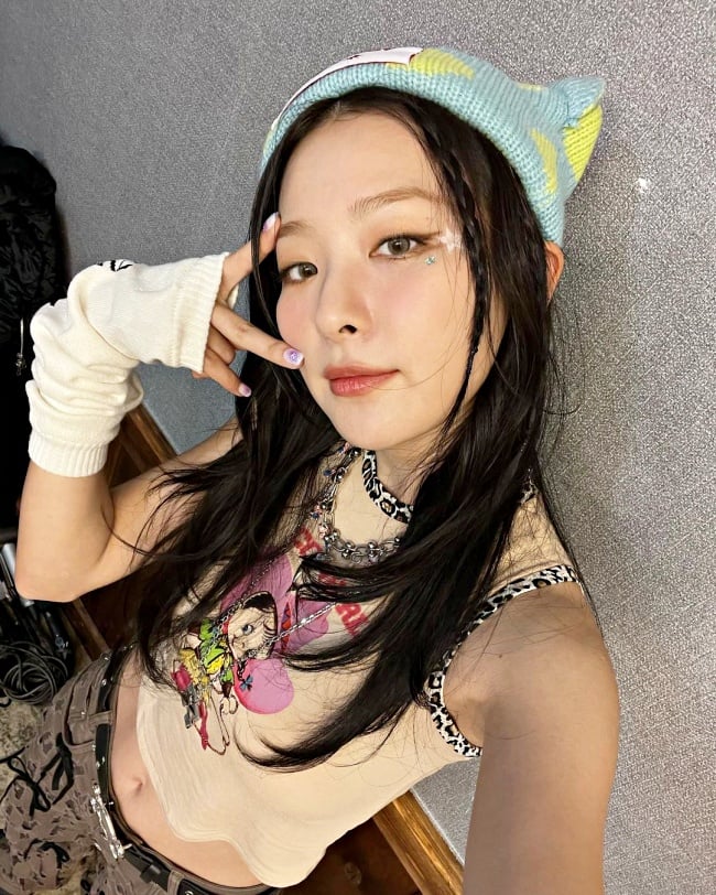 Red Velvet成員瑟琪則是大膽挑戰「寶寶藍+薄荷綠」的圖案撞色款,糖果般的繽紛配色,加上呆萌貓耳朵,根本是男心、女心最強縱火犯!!!