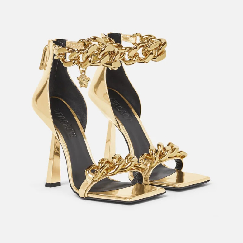 說到金光閃閃怎麼漏掉擅長浮誇的Versace,創意總監Donatella Versace把金屬鍊條放在高跟涼鞋上,小小的掛上美杜莎吊飾,粗鞋跟更是相對方便走,浮誇姐妹們一定要去店上看看!(參考價格:店洽)