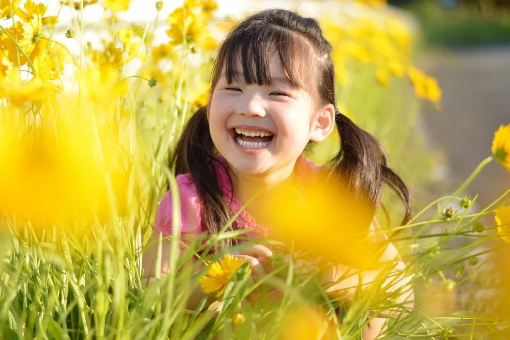 像是下圖,小女孩在花叢之間笑得燦爛,使用大光圈鏡頭拍下去,就能得到好看的散景。