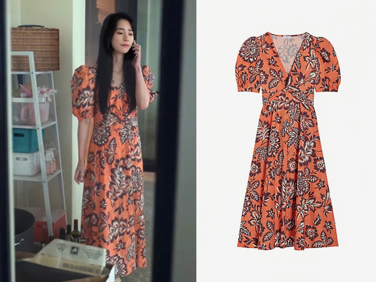 朴涎鎮打電話給學校時穿的這件亮橘色花洋裝,則是來自法國品牌 CLAUDIE PIERLOT 2022春夏系列中的花卉泡泡袖棉質洋裝,大約是新台幣9千元。亮麗的顏色,搭配V領及泡泡袖的設計,與朴涎鎮的明媚張揚的性格非常契合。不過這件目前也是缺貨中!