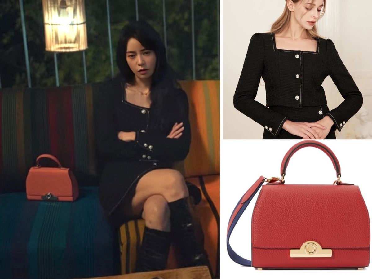 這套全黑的粗織花呢套裝來自韓國品牌GRACE U,整套大約是新台幣1萬元,另外還有象牙白的顏色,不過目前韓國和台灣都已經斷貨。放在椅子上的茜草紅色包包則是法國品牌MOYNAT 的 Réjane BB Handbag,大約新台幣15萬元!這個牌子有「有錢也買不到」的稱號,把朴涎鎮的千金身份彰顯出來。