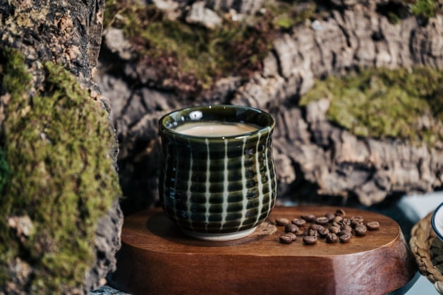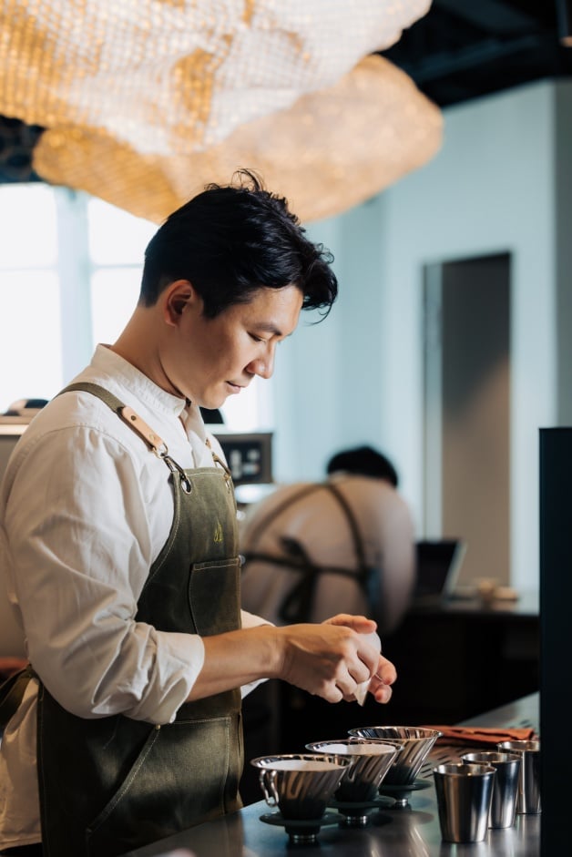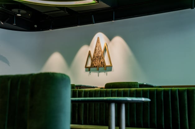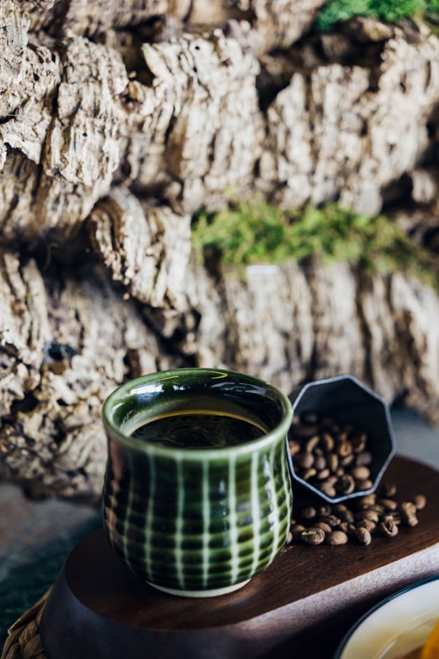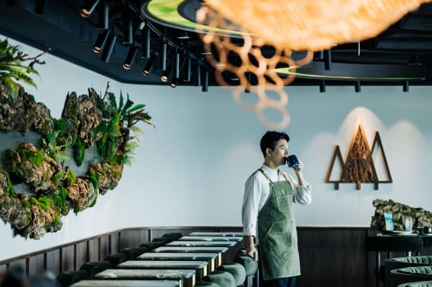 「天空興波」的店內空間再次找來擅長將迷人詩意融入空間細節的「硬是設計」操刀,創辦人吳透以「天空之城」為主題打造,將環狀吧檯的底座如山城基座,以綠色的台灣蛇紋石拼砌而成,高山苔綠被山形玻璃象徵的凜冰封存在吧檯後方,天花板宛如漂浮雲朵般的群山,是新銳藝術家康力升的作品「浮島」,搭配職人精萃的絕佳咖啡風味,絕對是雲端之上,天際中最極致的高空咖啡五感體驗!
