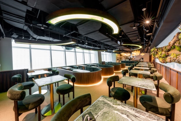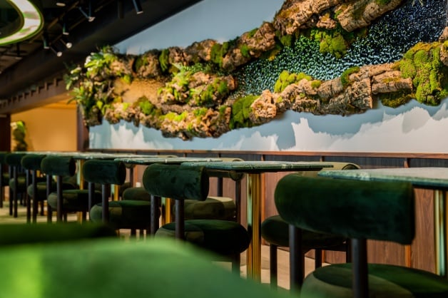 座位區背牆上長達11米的大型藝術裝置是硬是設計與「煙花蕨醒 Hanabi Plant」所共同創作,以經過處理的栓皮櫟樹皮,迤邐拾綴永生苔綠,模擬距今5000年前,古台北大澤漸漸乾涸,蜿蜒的淡水河階浮出地面,兩岸森林幽靄蓊鬱的地貌,比對現今在台北101窗前俯瞰的淡水河岸,台北5000年前的起點與窗前的文明盛世,穿越時空相映成趣,天空興波不只是對於一杯好咖啡的極致追求,也是另一個新的起點!