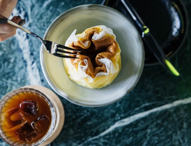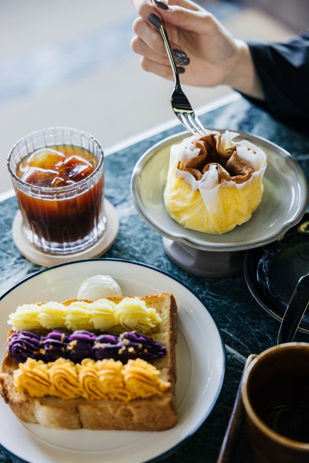 手工蛋糕有半熟蜂蜜蛋糕「皺皺」、宇治丸久小山園和光「抹茶卷」和四種酒提拉米蘇,輕食的部分則有鹽奶油、肉桂黑糖,其中妞編輯大推「地瓜三兄弟」,三種地瓜,內餡還有鹹蛋黃和肉鬆呢!