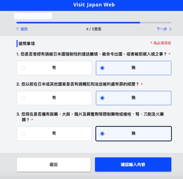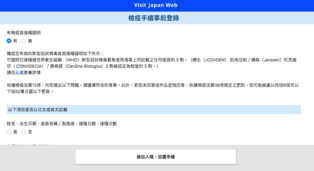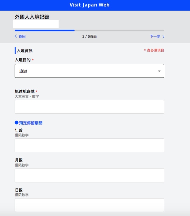 入境頁面包含入境目的、抵達航班號、預定停留期間,相關提問事項,確認輸入內容就完成啦!