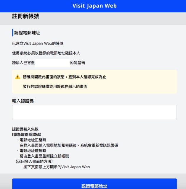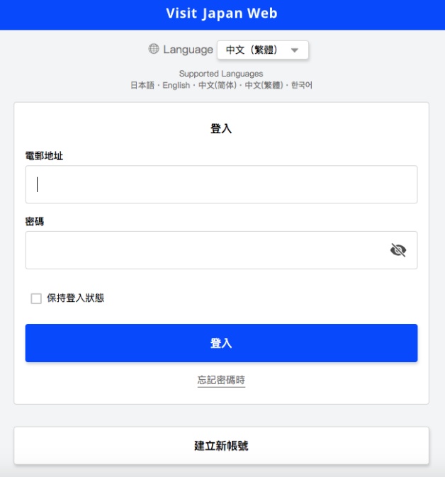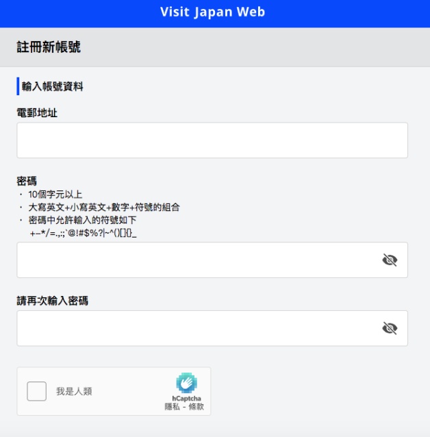 進入Visit Japan Web後,首次登入請先點選最底下的「建立新帳號」,輸入電子信箱和密碼,密碼一定要是「大寫英文+小寫英文+數字+符號」10個字元以上,完成後就可以到E-mail取得認證碼!