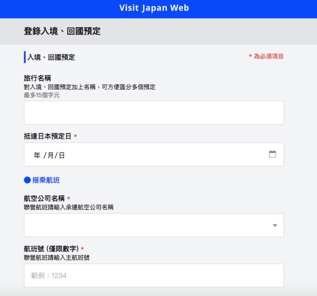 在「登錄入境、回國預定」中點選「新增登錄」,包含旅行名稱(可填可不填)、抵達日本預定日、搭乘航班的公司名稱和航班號(數字即好)、在日本的聯絡處(住宿地點)!