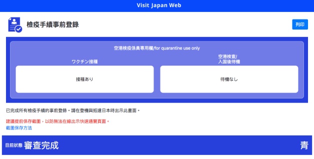 已完成所有「檢疫手續事前登錄」的頁面,未完成會是「紅色」,完成會是「青色」,這步很重要一定要檢查,在登機與抵達日本時出示此畫面即可,建議妞妞們提前保存截圖,以防無法在線出示快速通關頁面!