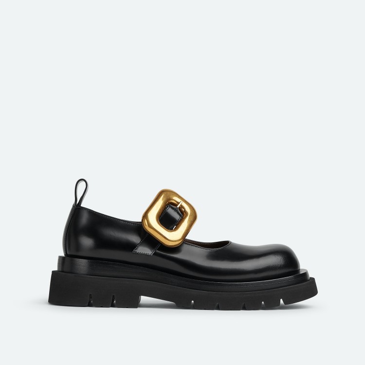 Bottega Veneta 在近年來在鞋履設計上一直很懂的玩弄“比例”,例如誇張大楦頭,或是超大的鞋底,其吸睛的設計方式,都讓女孩們愛不釋手,這款「Lug」瑪莉珍鞋,用浮誇的金扣做點綴,讓一黑皮鞋像戴上耳環一樣,時髦又吸睛!(商品售價:NTD43,500)